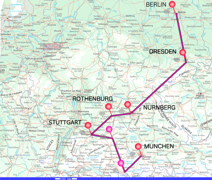 ベルリン→ドレスデン→ニュルンベルグ→ローテンブルグ→ギーンゲン→シュトゥットガルト→ ホーエンシュバンガウ→ミュンヘン