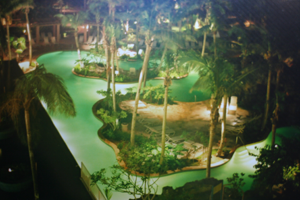 | お部屋からの眺めです。滝の音がちょっときになりました。ま、これもリゾートっぽくってよいか・・。 今回、娘は初の海外旅行でした。食事は結構大変でしたが(いろいろこぼすし、好き嫌いがあって大変)、 若い特権でちやほやされながら、なんとか楽しく過ごせました。 |