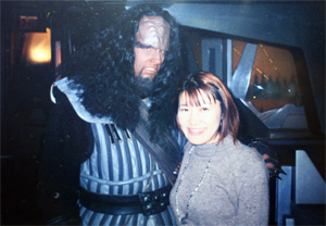 クワークのバーでクリンゴンとツーショットです。ハイポーズ。 「カプラ!」。写真を撮りたいが故にここヒルトンのクォークのバーに来る人もいるそうです。結構、体格のいいクリンゴンです。 |