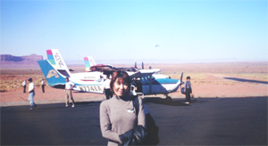 さて、次に「モニュメントバレー」へ移動です。忙しい〜。 グランドキャニオン空港からモニュメントバレー空港(?)へいきます。?がついているのはなぜでしょう。行けばわかります。(爆)写真を見ればわかりますが、まわりには何も無い滑走路があるだけです。正確には滑走路しかないです。(爆) |