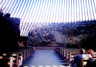| 第2日目 6月17日(金) 朝食は、ホテルのテラスでおしゃれにブッ フェスタ イル、パン、cafe、チーズ、ハム、フルーツと、とても充実したものでした。朝食後、朝早くから、始まっているマーケット広場へ、主に野菜、フルーツ、花などが売っており、見て歩くだけでも、楽しい。その近くのインフォメイションセンターに立ち寄り、バス、地下鉄 乗り放題の1日のツーリストチケットをGET、ますは、エスプラナデイを散歩、所々にベンチがあり、地元の人達が、座って会話に花を咲かせていました。フィンランドに来たなら、サンタクロース、残念ながら、サンタさんが住んでいるロバニエミには行けないので、ヘルシンキにあるサンタクロースカンパニィーでサンタさんからのお手紙を申し込できました。そうすると、クリスマスにサンタさんから手紙が届くのです。クリスマスが、楽しみです。その後、トラムで、世界遺産のテンペリアウキオ教会へ行きました。外観は、さほど、インパクトがないのですが、洞窟に入るように中に入ると、岩で囲まれ、大きな天窓からの明るい日ざしが照り、クラッシックの音楽が流れ、やけに、落ち着き、厳粛な気持ちになってしまう、不思議な教会です。 |