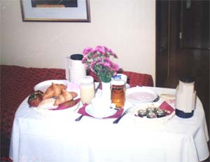 第5日目 6月20日(月) 朝食付きで部屋を予約していたのですが、レストランが開く前の出発となるので、前日にレセプションに聞いてみると、部屋に持ってきてくれるというであありませんか。それがこの写真。 も〜も〜すばらしいの一言。 |